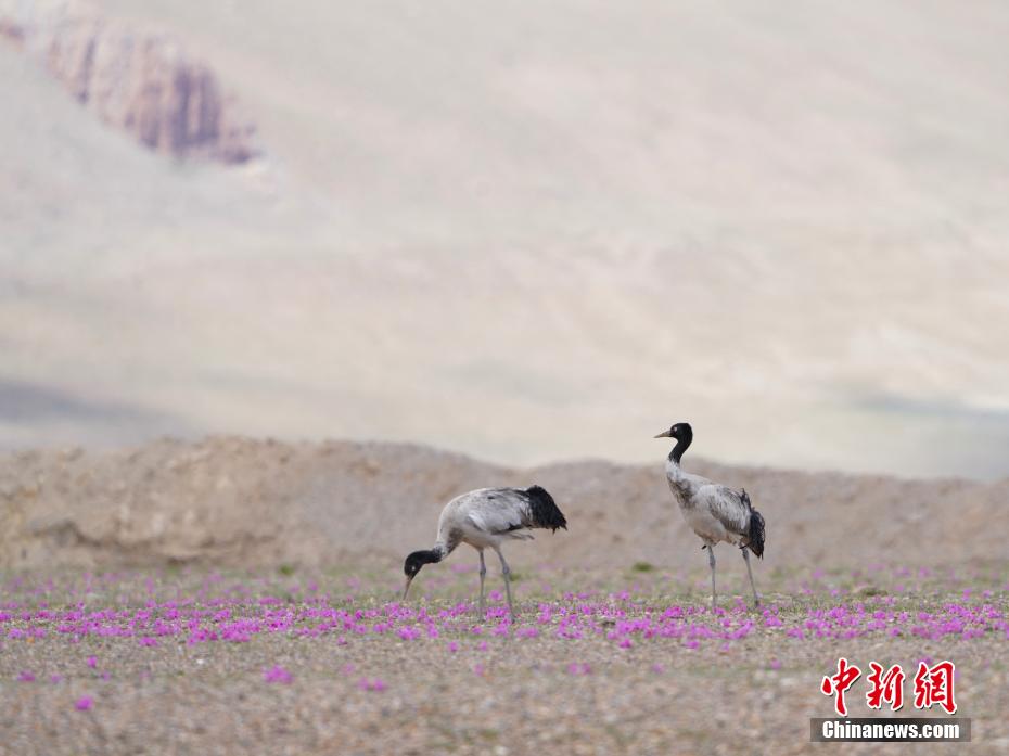 6月12日,西藏那曲市申扎縣黑頸鶴在花叢中覓食。申扎縣,平均海拔超過4500米,是黑頸鶴在中國的主要繁殖地之一。每年4月到6月,成群的黑頸鶴會來到這里,筑巢、孵化、養(yǎng)育下一代。近年來,為了保護(hù)這些珍貴的生靈,申扎縣采取了一系列措施,設(shè)立了監(jiān)測站,對黑頸鶴的棲息地進(jìn)行24小時監(jiān)控,確保它們的繁殖不受干擾。黑頸鶴是國家一級保護(hù)動物,也是世界上唯一一種生長、繁殖在高原的鶴類。貢嘎來松 攝