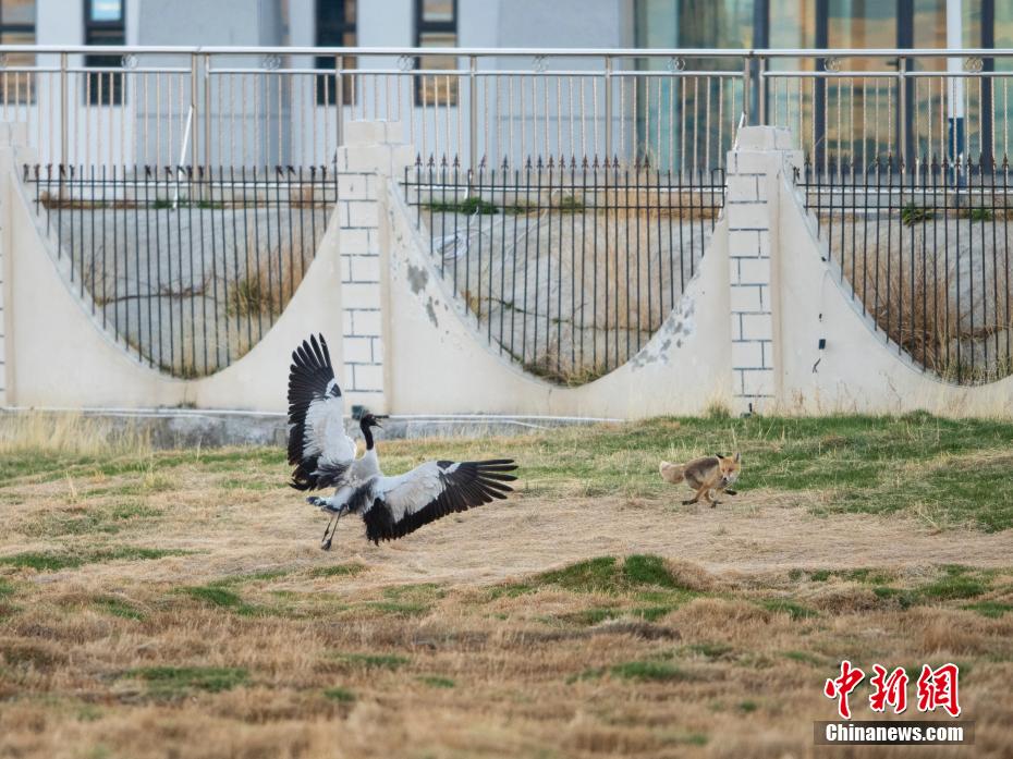 6月12日,西藏那曲市申扎縣濕地里一只黑頸鶴在驅(qū)趕狐貍。申扎縣,平均海拔超過4500米,是黑頸鶴在中國的主要繁殖地之一。每年4月到6月,成群的黑頸鶴會來到這里,筑巢、孵化、養(yǎng)育下一代。近年來,為了保護(hù)這些珍貴的生靈,申扎縣采取了一系列措施,設(shè)立了監(jiān)測站,對黑頸鶴的棲息地進(jìn)行24小時監(jiān)控,確保它們的繁殖不受干擾。黑頸鶴是國家一級保護(hù)動物,也是世界上唯一一種生長、繁殖在高原的鶴類。貢嘎來松 攝
