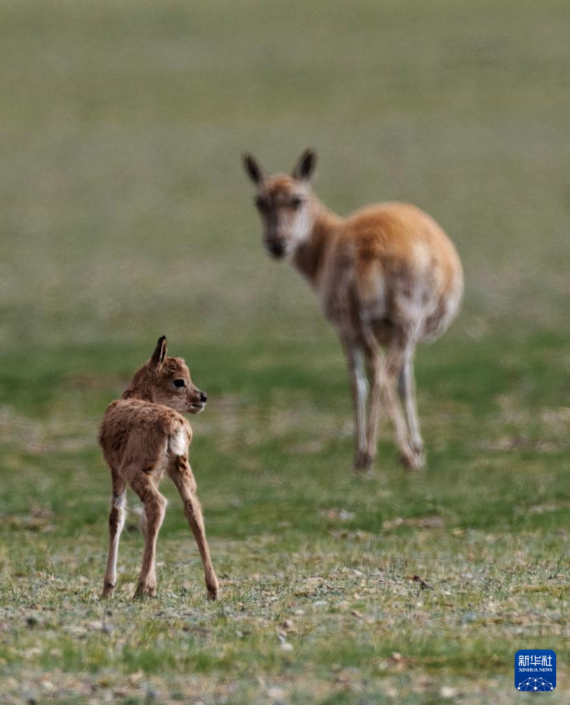 6月17日,在魯確塘草原,一只剛出生不久的小藏羚羊跟著母藏羚羊在草原上漫步。新華社記者 費茂華 攝