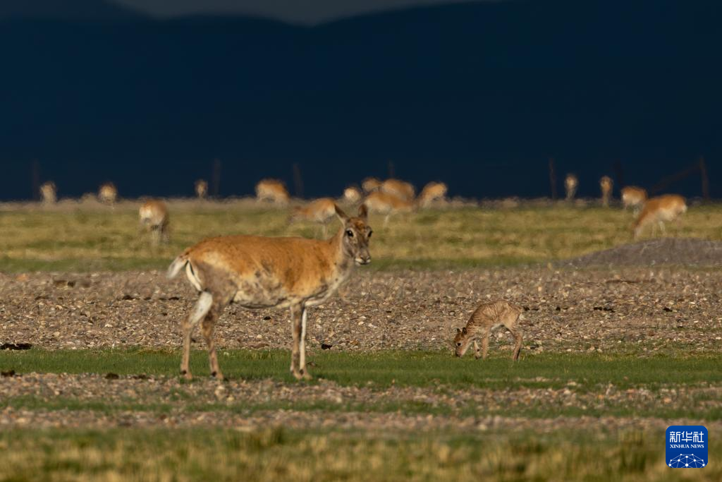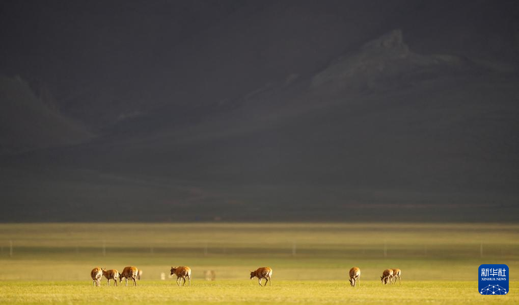 夕陽下,母藏羚羊在魯確塘草原上活動(6月16日攝)。新華社記者 晉美多吉 攝