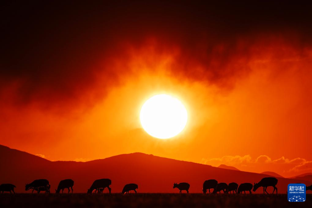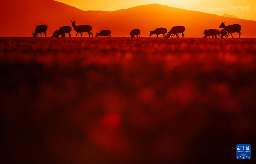 在魯確塘草原上,待產(chǎn)的藏羚羊在霞光的包圍中進食(6月16日攝)。新華社記者 費茂華 攝