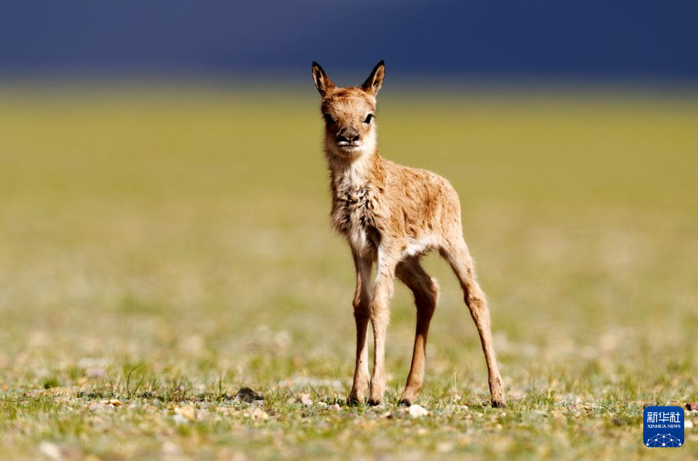 魯確塘草原上臍帶尚未脫落的小藏羚羊(6月17日攝)。新華社記者 姜帆 攝
