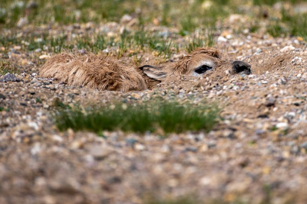 經(jīng)過(guò)6個(gè)月懷胎,它順利誕下一只黑褐色的小生命。小藏羚羊的臍帶剛剛斷開(kāi),無(wú)法站穩(wěn),母藏羚羊迅速跑開(kāi)近百米,直到小藏羚羊身上沾滿砂石,搖搖晃晃地支撐起后腿,用黑色的鼻子輕嗅草地,它才回來(lái)舔舐孩子的身體。