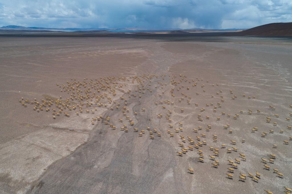 這是在甜水河畔荒灘雪地中向產(chǎn)羔地遷徙的藏羚羊(6月14日攝 無(wú)人機(jī)照片)。新華社記者 普布次仁 攝