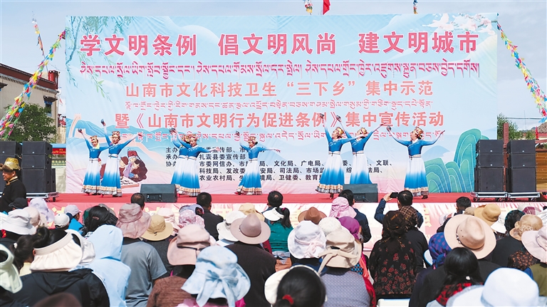 近日,山南市委宣傳部、市文明辦聯(lián)合扎囊縣委宣傳部在扎囊縣阿扎鄉(xiāng)章達村,開展了以“學文明條例 倡文明風尚 建文明城市”為主題的山南市文化科技衛(wèi)生“三下鄉(xiāng)”集中示范暨《山南市文明行為促進條例》集中宣傳活動?!D為活動現(xiàn)場。記者 汪純 攝