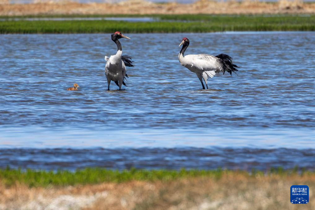 這是在那曲市申扎縣拍攝的養(yǎng)育雛鳥(niǎo)的黑頸鶴(6月9日攝)。新華社記者 晉美多吉 攝