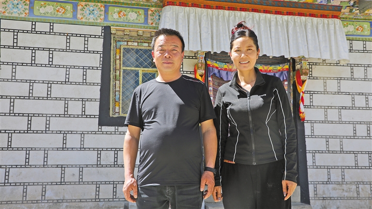 謝軍成達(dá)娃卓嘎夫婦在自家新房門前合影。