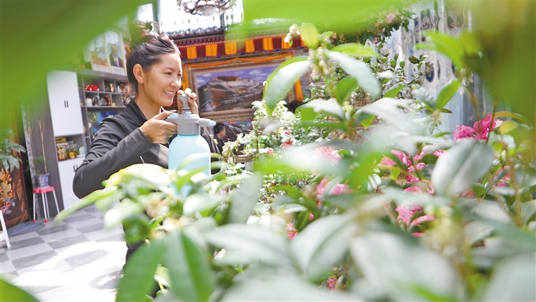 達(dá)娃卓嘎在澆花。