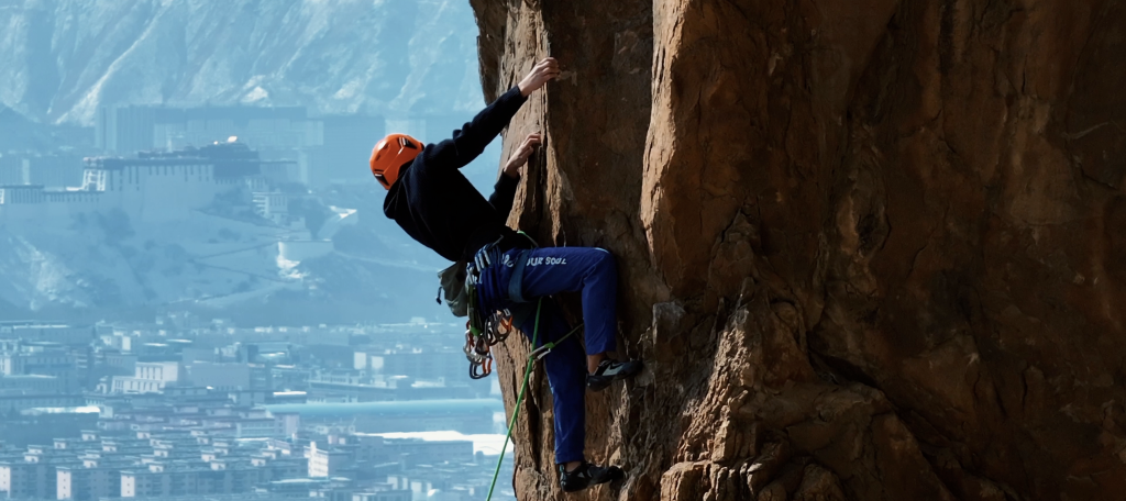 在位于拉薩的自然巖壁下,教練為穆澤潤講解攀巖技巧
