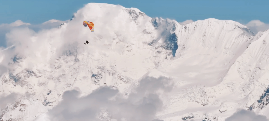 李生濤在羊卓雍錯湖上飛滑翔傘