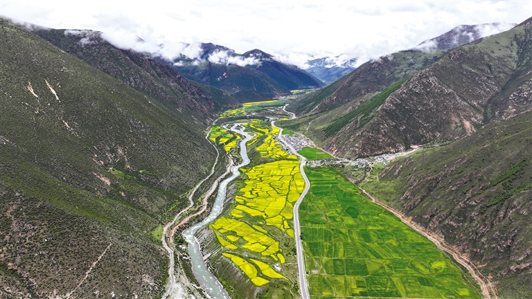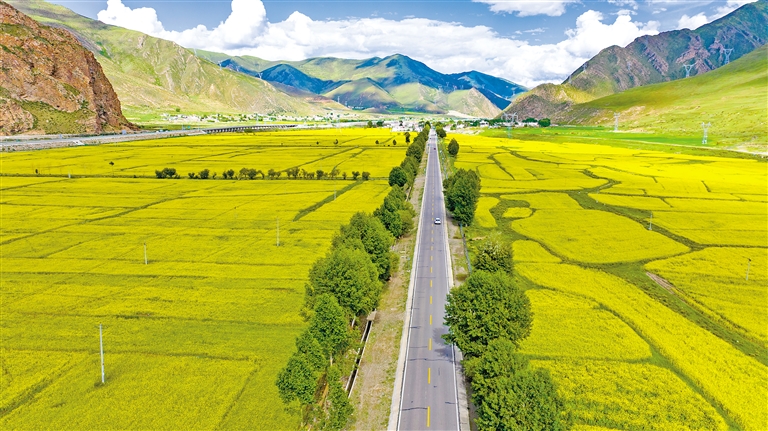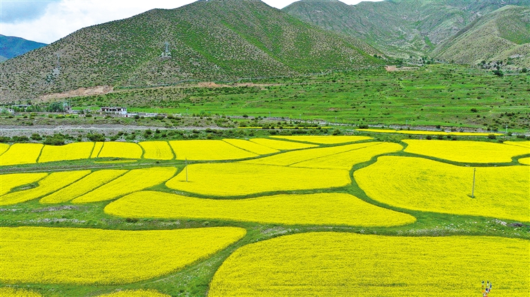 最近,墨竹工卡縣迎來了油菜花的盛開時(shí)節(jié)。放眼望去,滿目的油菜花如同金黃色的毯子般鋪展開來,在微風(fēng)中搖曳,散發(fā)出迷人的香氣。一團(tuán)團(tuán)、一簇簇的金黃色花朵點(diǎn)綴在田野上,流動(dòng)著濃濃夏意。成片的花海與蜿蜒的農(nóng)村公路、錯(cuò)落有致的村居共同構(gòu)成了一幅和諧美麗的田園風(fēng)景圖。