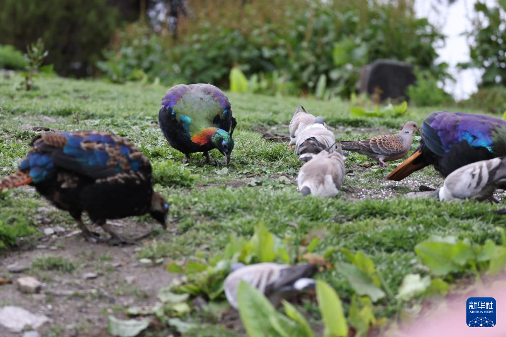 這是7月23日拍攝的亞成體雄性棕尾虹雉(左一)與成鳥一起覓食的場(chǎng)景。新華社記者 姜帆 攝