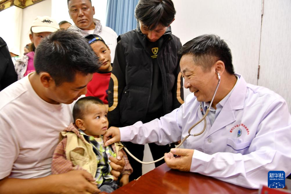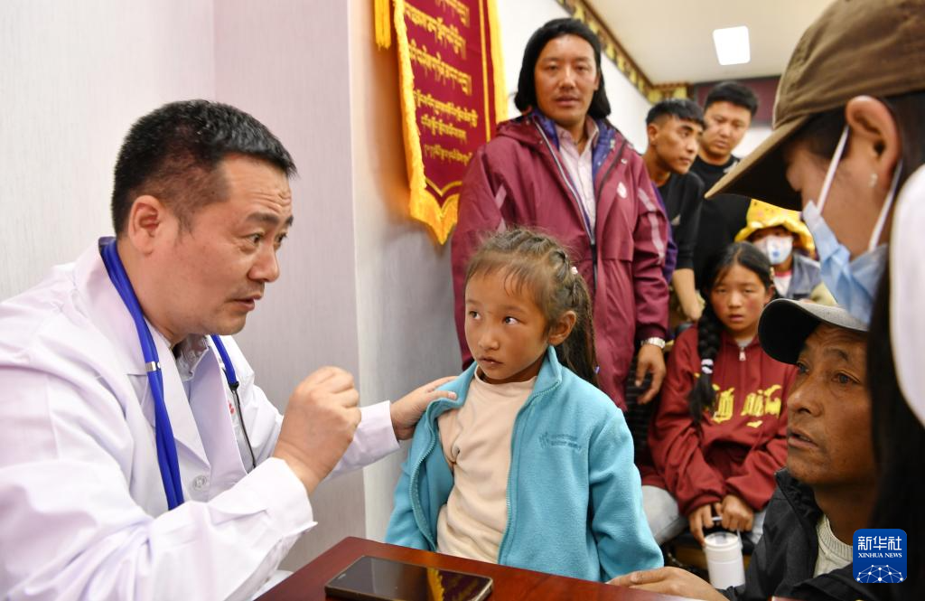 7月23日,南京醫(yī)科大學附屬兒童醫(yī)院心胸外科主任戚繼榮(左)在墨竹工卡縣為兒童體檢。新華社記者 張汝鋒 攝