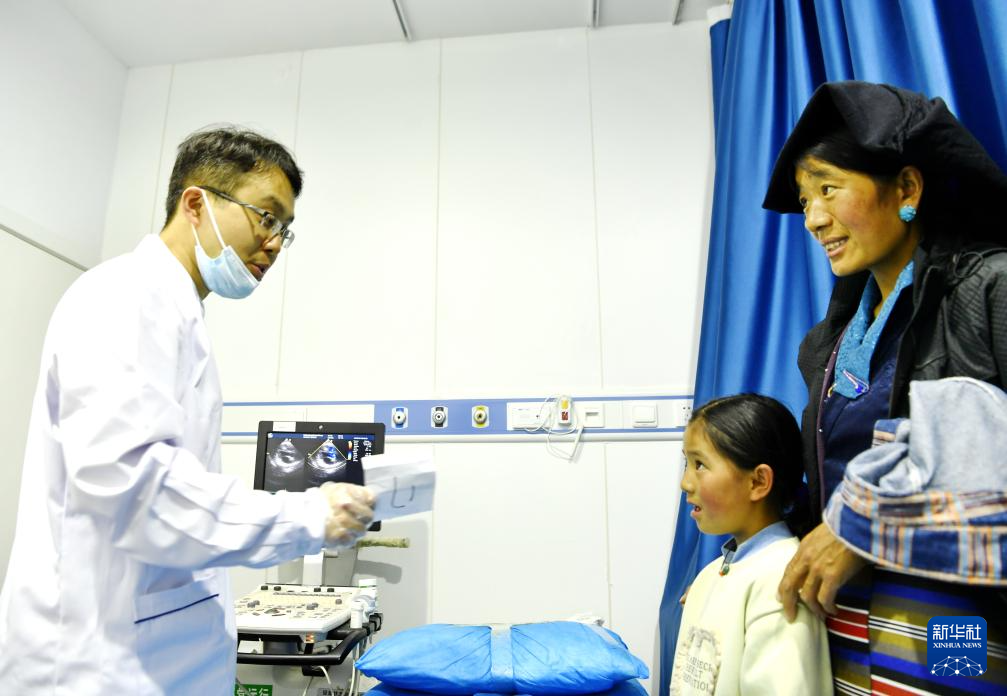 7月23日,南京醫(yī)科大學附屬兒童醫(yī)院副主任醫(yī)師胡銳在墨竹工卡縣與已做心臟超聲檢查的兒童及其家長交流。新華社記者 張汝鋒 攝