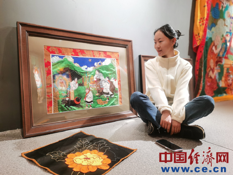 圖為巴桑德吉和她的《羌塘牧區(qū)圖》堆繡裝飾畫。 中國經(jīng)濟網(wǎng)記者魏金金/攝