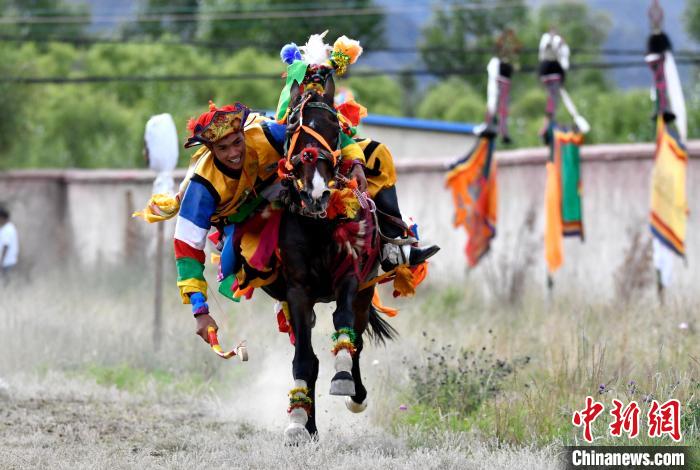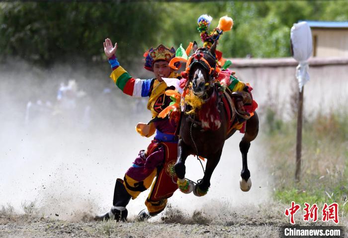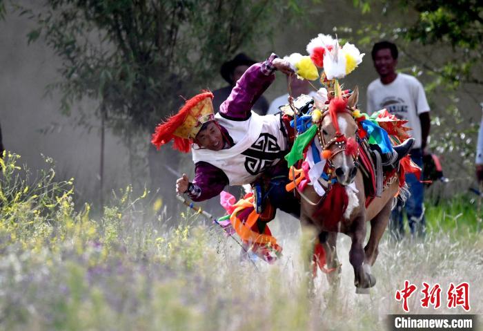 7月27日,西藏拉薩市桑達(dá)村迎來“望果節(jié)”,村民們舉行賽馬活動慶祝?!巴?jié)”是西藏傳統(tǒng)的豐收節(jié),具體日期隨各地莊稼成熟的時(shí)間而變化?!巴?jié)”期間,按照習(xí)俗,各地都會舉辦賽馬比賽。圖為騎手進(jìn)行馬術(shù)表演。中新社記者 李林 攝