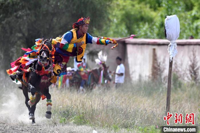 7月27日,西藏拉薩市桑達(dá)村迎來“望果節(jié)”,村民們舉行賽馬活動慶祝?!巴?jié)”是西藏傳統(tǒng)的豐收節(jié),具體日期隨各地莊稼成熟的時(shí)間而變化?!巴?jié)”期間,按照習(xí)俗,各地都會舉辦賽馬比賽。圖為騎手進(jìn)行馬上射箭表演。中新社記者 李林 攝