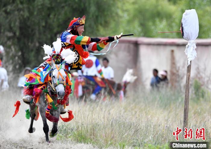 7月27日,西藏拉薩市桑達(dá)村迎來“望果節(jié)”,村民們舉行賽馬活動慶祝。“望果節(jié)”是西藏傳統(tǒng)的豐收節(jié),具體日期隨各地莊稼成熟的時(shí)間而變化?!巴?jié)”期間,按照習(xí)俗,各地都會舉辦賽馬比賽。圖為騎手進(jìn)行馬上射擊表演。中新社記者 李林 攝