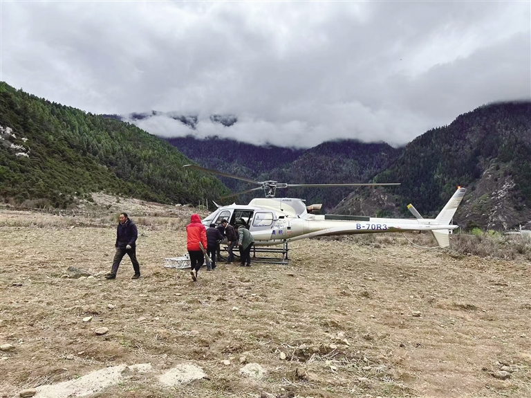 直升機裝載相關設備,準備起飛監(jiān)控堰塞湖情況。