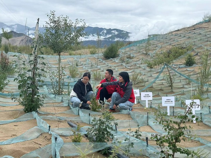中國科學院成都山地災(zāi)害與環(huán)境研究所研究員周萍帶領(lǐng)研究生在西藏扎囊縣沙化土地生態(tài)治理綜合示范區(qū)開展沙地試驗樣方植被生長狀況監(jiān)測。新華社記者 顧天成 攝
