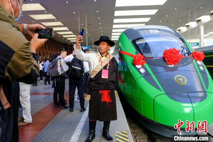 資料圖為2021年6月25日,西藏拉林鐵路開通運營,拉薩曲水縣三有村村民次旦平措在復興號前拍照留念。記者 江飛波 攝