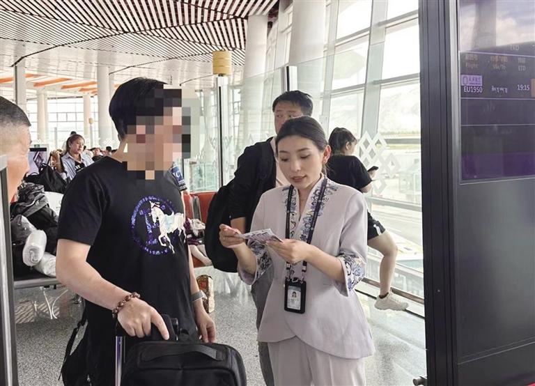達(dá)娃曲珍在為機(jī)場(chǎng)旅客解答問(wèn)題。