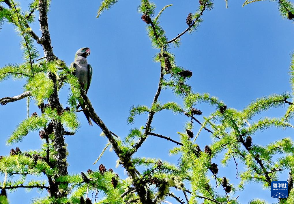 棲息在巴松措旅游風景區(qū)內的大紫胸鸚鵡(8月2日攝)。新華社記者 張汝鋒 攝