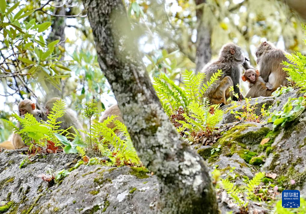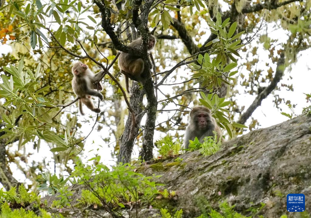 巴松措旅游風景區(qū)里嬉戲的藏獼猴(8月2日攝)。新華社記者 張汝鋒 攝