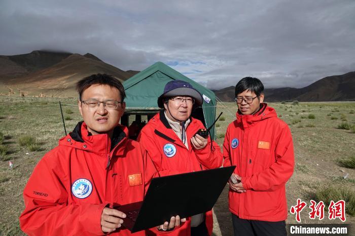 8月8日,珠峰地區(qū)試驗(yàn)團(tuán)隊(duì)負(fù)責(zé)人賈立研究員(中)和隊(duì)員鄭超磊副研究員(右)、蔣敏助理研究員在試驗(yàn)場(chǎng)交流,與無人機(jī)起降點(diǎn)工作人員聯(lián)系。中新網(wǎng)記者 孫自法 攝