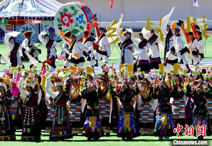 8月10日,2024年那曲恰青賽馬節(jié)暨第三屆“鄉(xiāng)村振興 那曲奮進”活動開幕式在那曲市賽馬場舉行,精彩的文藝歌舞、馬術(shù)表演等展示著羌塘草原上的無窮魅力和活力。圖為開幕式文藝表演現(xiàn)場。中新社記者 李林 攝