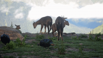 清晨,喜馬拉雅斑羚、棕尾虹雉、珠頸斑鳩等各類動物出現(xiàn)在山間的一處平臺上,吸引周邊的游人欣賞這自然之美。