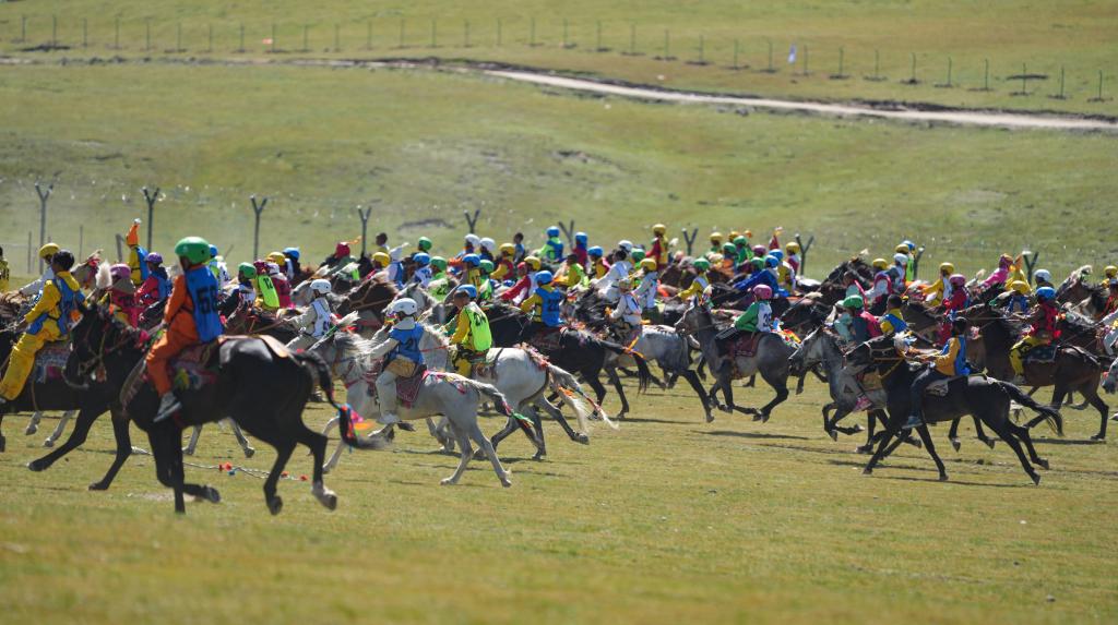 12日,10公里傳統(tǒng)大跑項(xiàng)目開賽,上百匹駿馬在草原上揚(yáng)蹄疾奔,騎手多是十來(lái)歲的少年。15歲的普扎巴從6歲開始做騎手,曾騎著當(dāng)?shù)卦S多名馬到各地參加比賽,拿過(guò)多次冠軍?!拔蚁嘈胚@次也能拿第一名?!?0日,他在馬背上對(duì)記者說(shuō)。