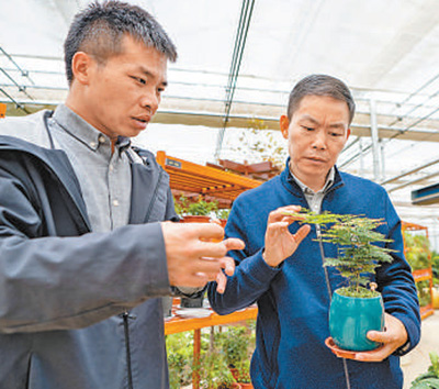 胡發(fā)煒(右)在紅河谷農(nóng)業(yè)園區(qū)查看盆栽生長(zhǎng)情況。記者 徐馭堯攝