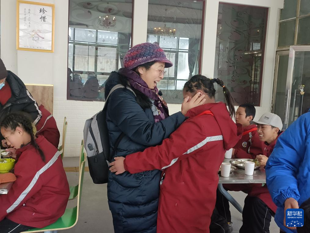 那曲市特殊教育學(xué)校的食堂里,次仁拉姆校長(zhǎng)和提前返校的學(xué)生見(jiàn)面(8月23日攝)。新華社發(fā)(白瑪朗杰攝)