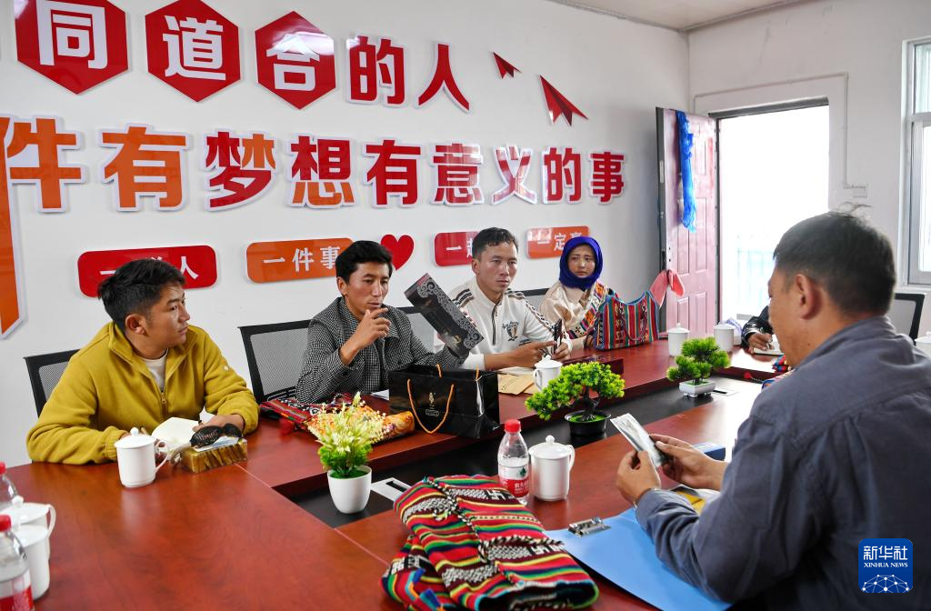倉秋多吉(左二)和團(tuán)隊(duì)核心成員商討產(chǎn)品銷售提升策略(8月24日攝)。新華社記者 張汝鋒 攝