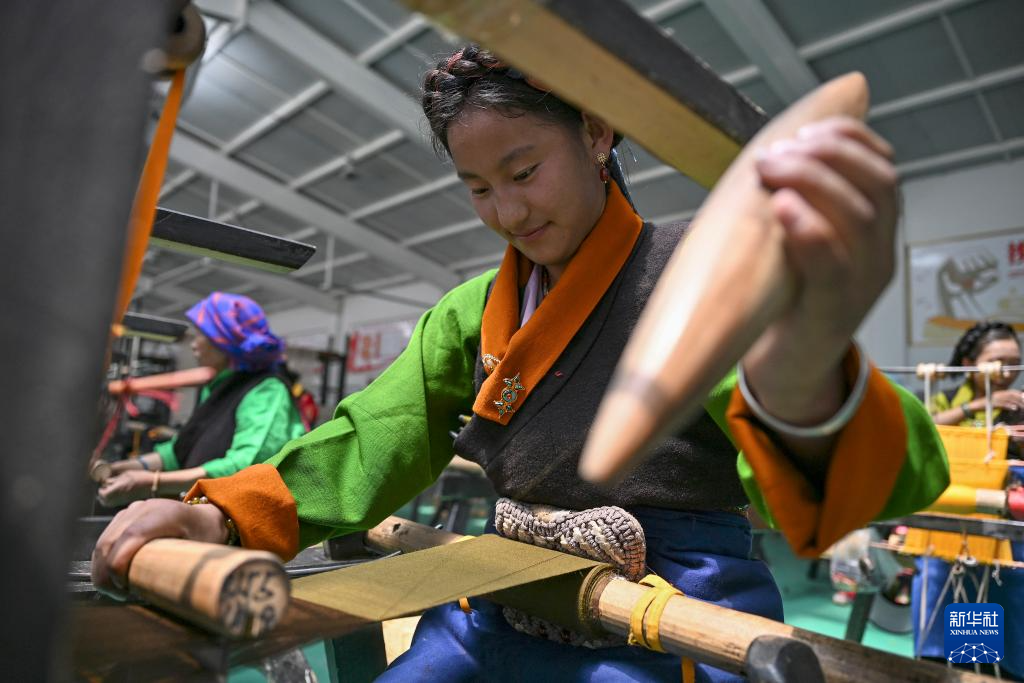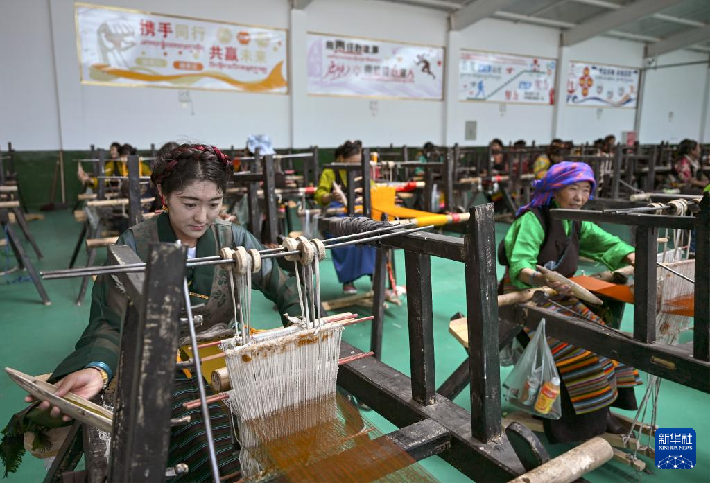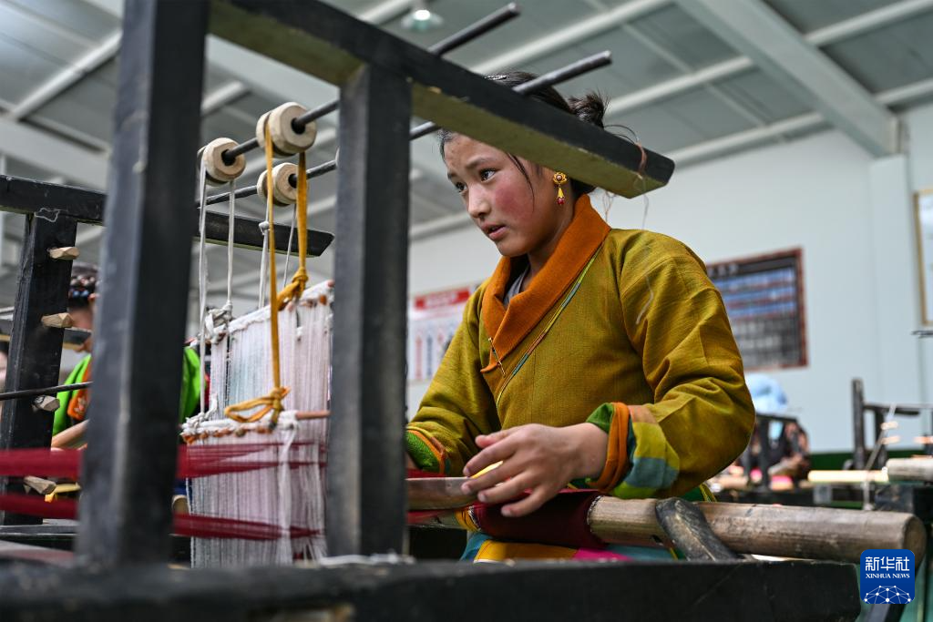 9月1日,在西藏日喀則市仁布縣特色產(chǎn)業(yè)孵化園,亞德細褐羊毛織品農(nóng)民專業(yè)合作社工作人員在車間里織布。新華社記者 孫瑞博 攝