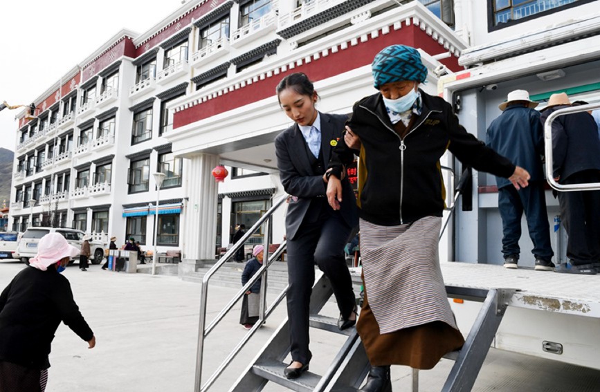 圖為山南市乃東區(qū)集中供養(yǎng)中心老人正在流動(dòng)金融服務(wù)車辦理業(yè)務(wù)。人民網(wǎng)記者 次仁羅布攝