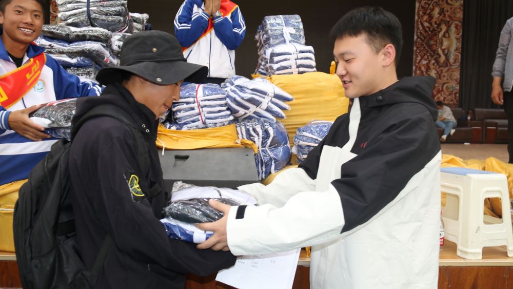 9月6日,中央民族大學(xué)第26屆研究生支教團成員侯宇航(右)為拉薩那曲第二高級中學(xué)報到新生發(fā)放生活用品。(嘎瑪曲宗 攝)