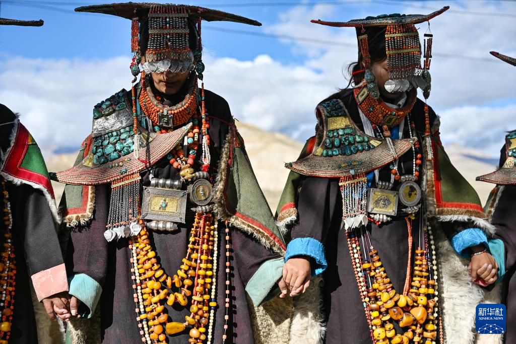 9月9日,在西藏阿里地區(qū)普蘭縣科迦村,村民身著普蘭服飾表演宣舞。新華社記者 孫瑞博 攝