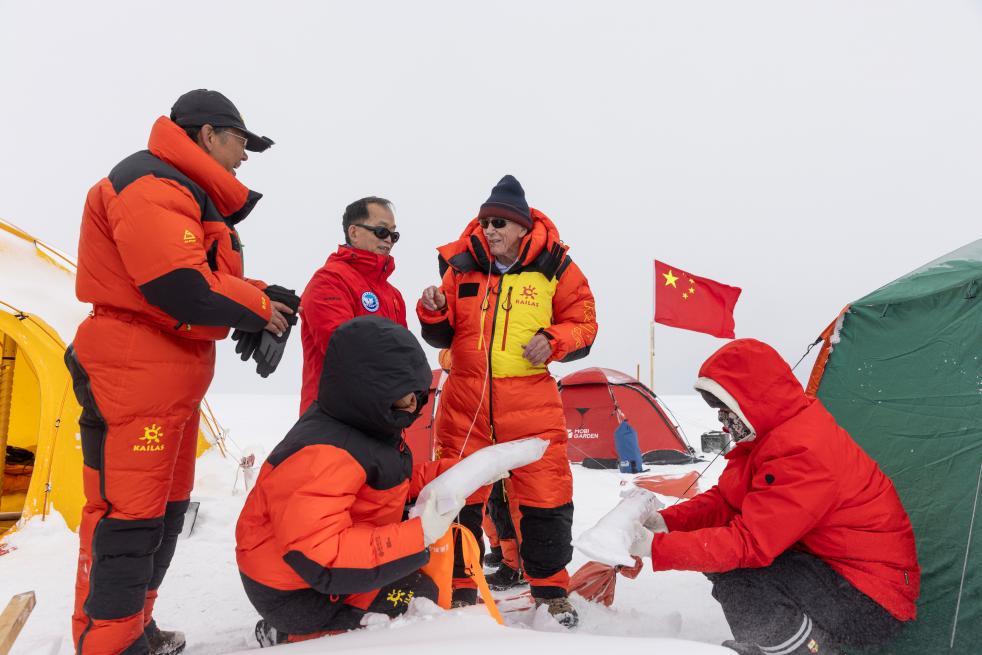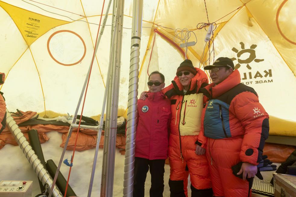 姚檀棟(左一)、湯普森(左二)在普若崗日冰原10號冰川冰穹C作業(yè)點工作帳篷內(nèi)與冰芯鉆取工作負責(zé)人徐柏青研究員合影。新華社記者姜帆 攝