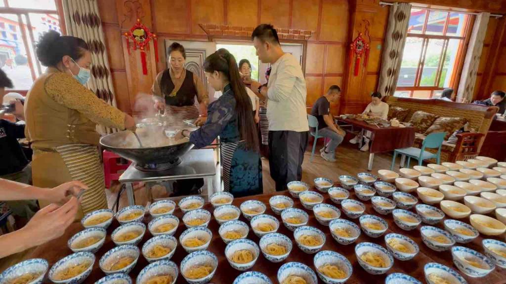 “目前店里紀(jì)錄保持在147碗?!痹诩{西民族鄉(xiāng)經(jīng)營果拉叢農(nóng)家樂的果拉卓瑪說,“但生活再好也不能浪費(fèi)。我們會(huì)提醒客人,如果吃飽了,只需用筷子在碗上搭出尖尖,就會(huì)停止加面;但對(duì)于不搭筷子的客人,我們還會(huì)再勸一碗。”