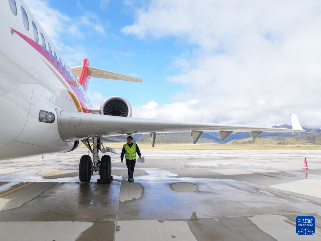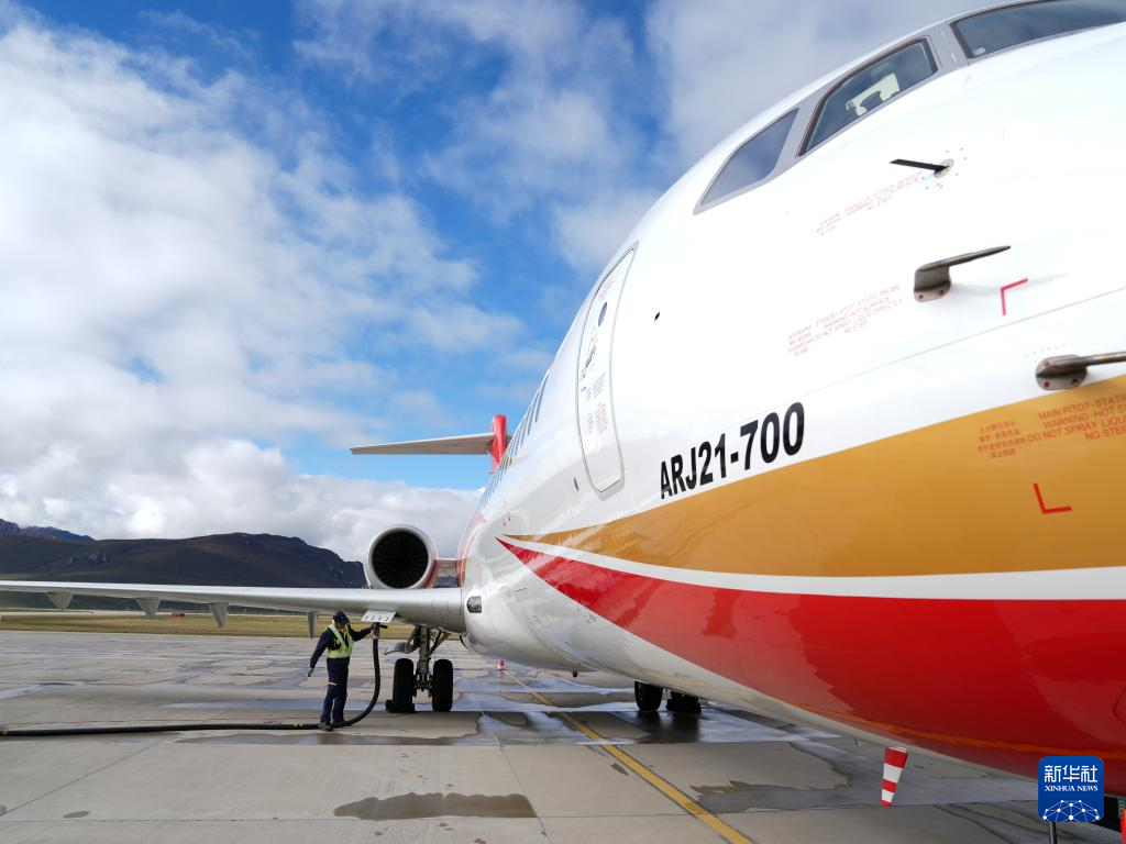 9月21日,國產(chǎn)商用飛機(jī)ARJ21停放在西藏拉薩貢嘎國際機(jī)場(chǎng)停機(jī)坪上。新華社記者 丁汀 攝