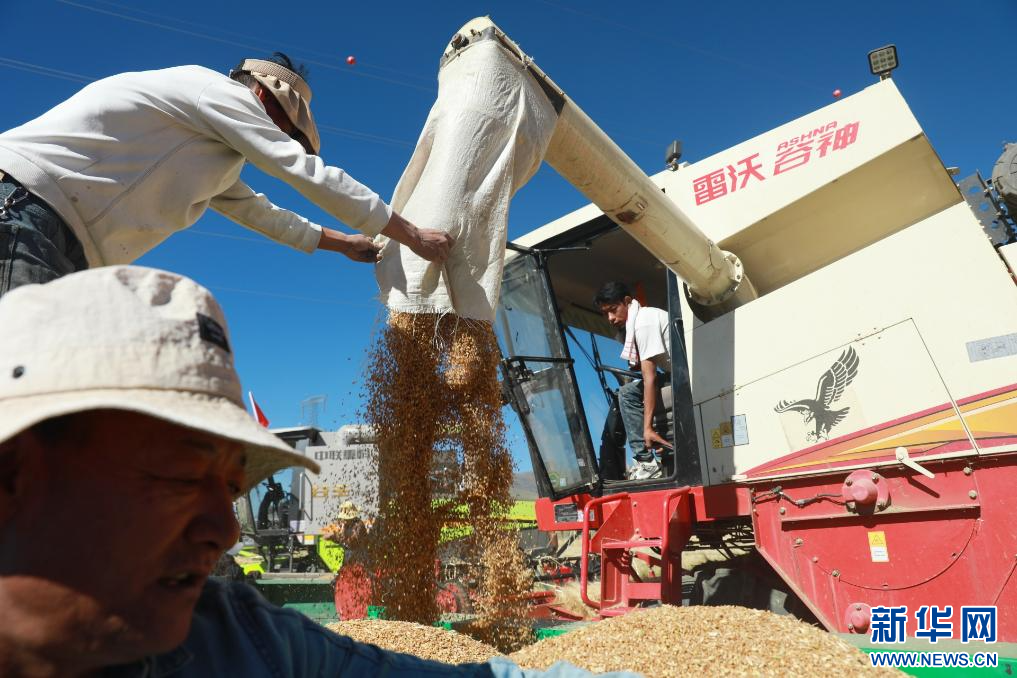 9月19日,墨竹工卡縣村民在進行機械化收割。新華網(wǎng)發(fā) 益果攝