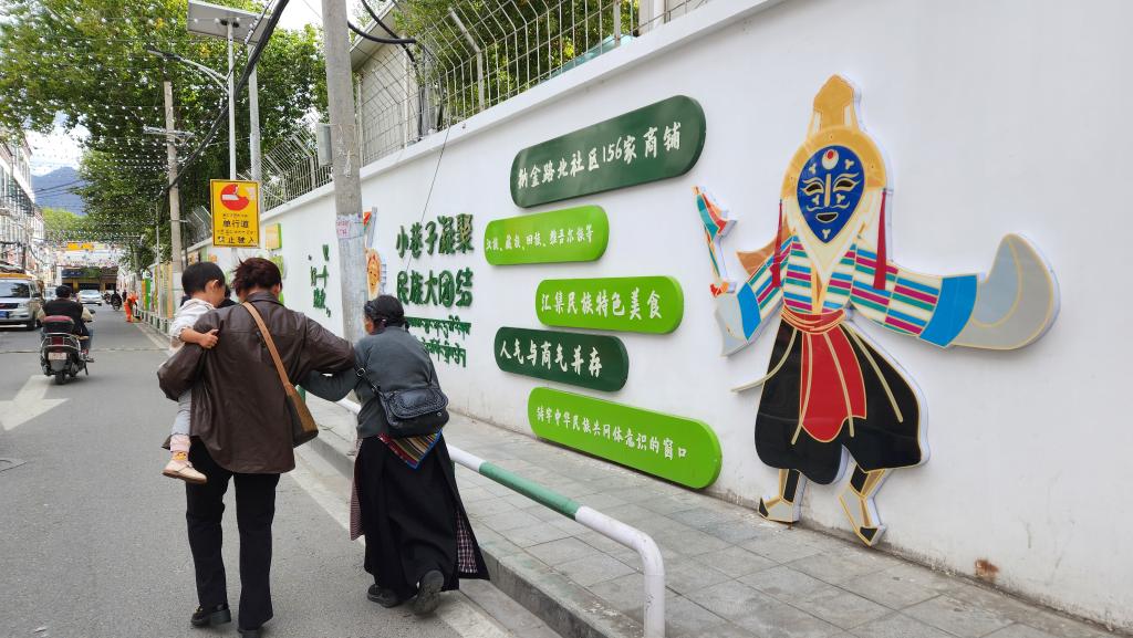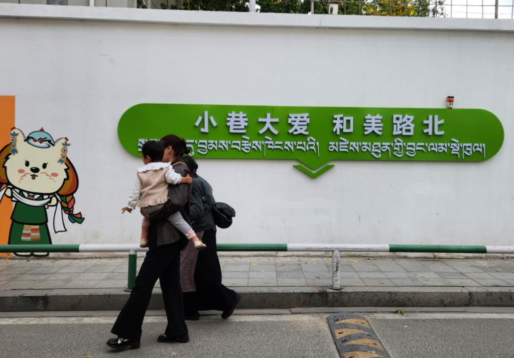 配合路政部門把洽瑪崗路改為單行道,讓街道靜下來;協(xié)同三大運營商,把街上縱橫交錯的“飛線”收進沿街橋架,還行人一片藍天;對接專業(yè)設計團隊,以本地犬種拉薩阿普索犬設計社區(qū)IP形象“嘎嘎”(意為快樂),街角的墻繪、樹上的引導牌、商戶的門臉上都能看到這只可愛的小狗……社工旦增晉美對社區(qū)的變化如數(shù)家珍。