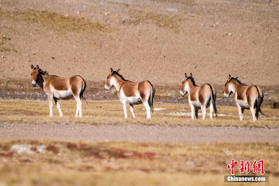 圖為10月3日,羌塘草原上的一群藏野驢悠閑覓食。中新社記者 江飛波 攝