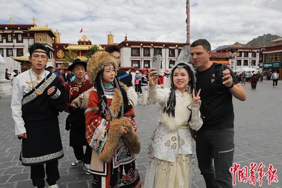 9月2日,西藏拉薩市八廓街,來(lái)自俄羅斯的巴德里(右一)與身穿藏族傳統(tǒng)服裝的年輕游客合影留念。近年來(lái),來(lái)拉薩旅游,到八廓街、布達(dá)拉宮廣場(chǎng)拍一套藏服寫真,已經(jīng)成為進(jìn)藏旅游年輕人的“標(biāo)配”。中青報(bào)·中青網(wǎng)記者 孔斯琪/攝