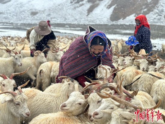 9月13日,西藏阿里地區(qū)日土縣熱幫鄉(xiāng)龍門卡村迎來(lái)了一場(chǎng)雪。在海拔近4800米的龍門卡村夏季牧場(chǎng),牧民們把待擠奶的白絨山羊依次用繩子拴起來(lái)。中青報(bào)·中青網(wǎng)記者 石佳/攝