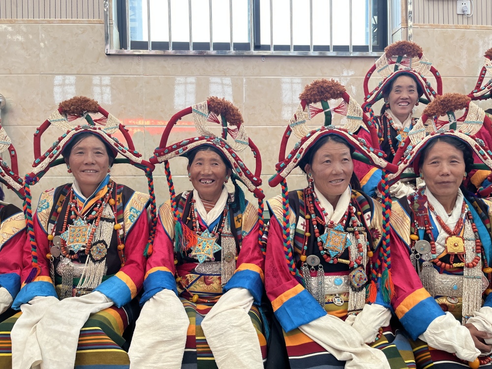 現(xiàn)在的諧欽隊共有67名成員,30歲以下的年輕人有8人,云丹卓瑪老阿媽也如愿收了一名“關(guān)門弟子”曲桑。她是諧欽隊的現(xiàn)任隊長,從事諧欽已有20多年,后被評為薩爾諧欽市級非遺傳承人?!拔覀兞η笤诒A羲_爾諧欽原汁原味的基礎(chǔ)上,在舞步與服飾上有所改進,更好地展現(xiàn)當代農(nóng)牧民的風采?!彼f。