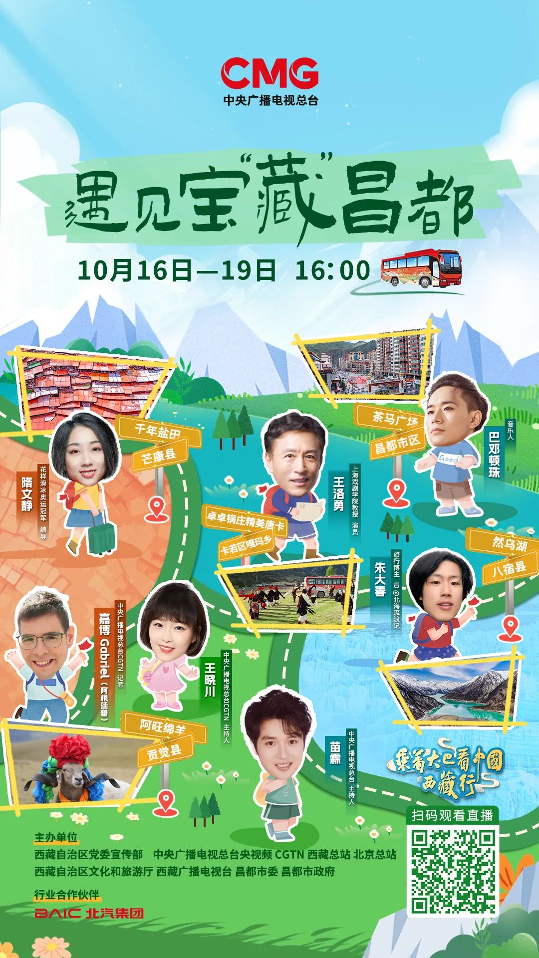 10月16日至10月19日,“跨越山海 格?;ㄩ_——乘著大巴看中國 西藏行”大型融媒體活動播出,總臺大巴車開進西藏昌都,自芒康過貢覺,經卡若到八宿,海拔從2300米一路攀升,探訪團深入千年鹽田,探秘萬年冰川,品嘗原生態(tài)的“阿旺綿羊”,領略中國民間文化藝術之鄉(xiāng)——嘎瑪鄉(xiāng)的風采,多彩的地貌風光與璀璨的藏東文化,盡顯昌都文化魅力。本次活動由西藏自治區(qū)黨委宣傳部、中央廣播電視總臺央視頻、CGTN、西藏總站、北京總站和西藏自治區(qū)文化和旅游廳、西藏廣播電視臺、昌都市委市政府聯合主辦。