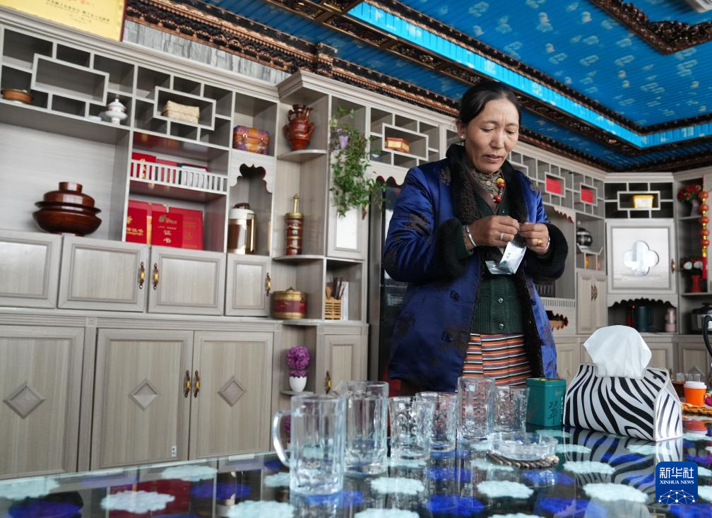 紐林塘村村民格桑卓瑪在整理客廳(10月14日攝)。新華社記者 丁汀 攝